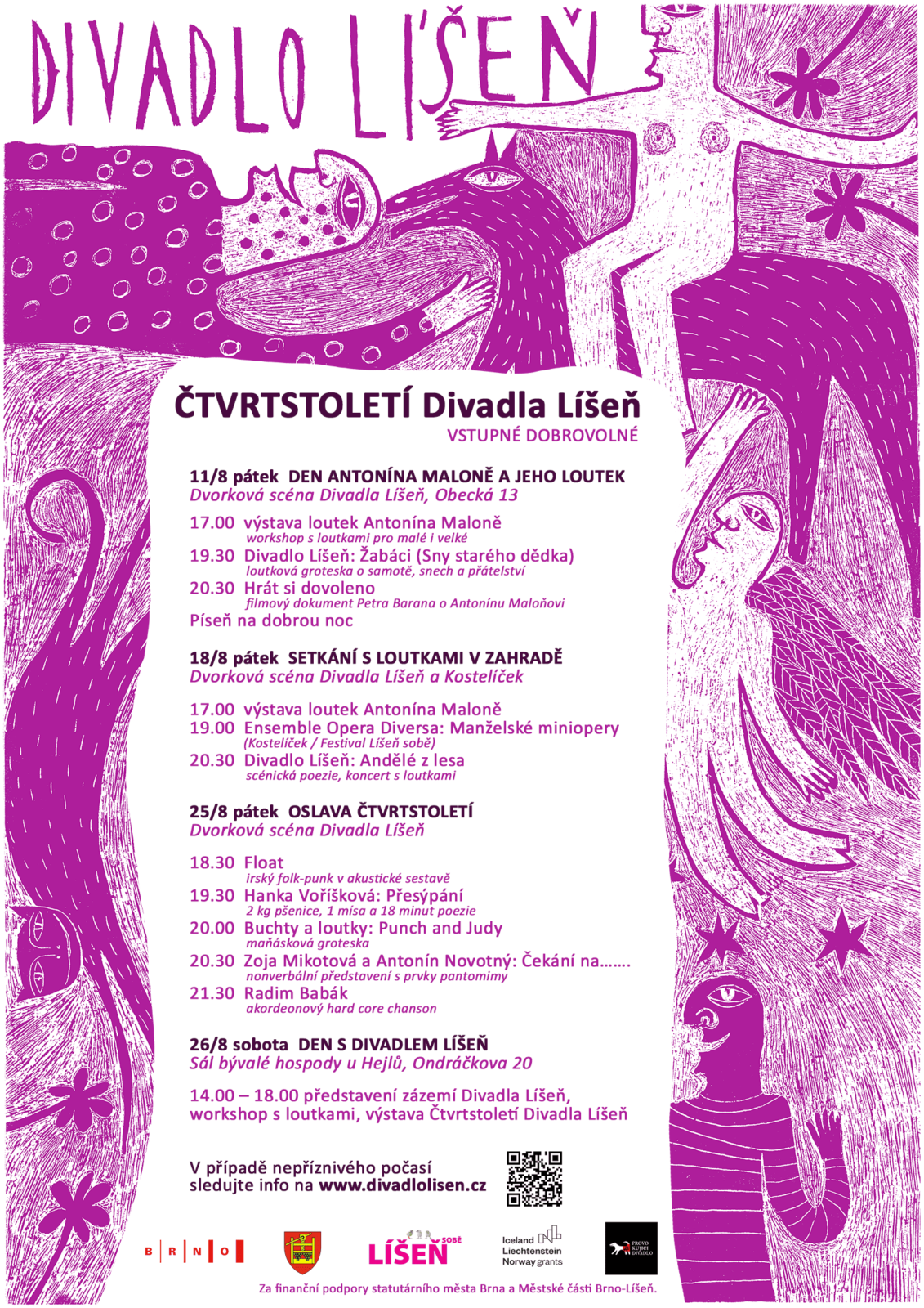 Líšeň Theater was born in Brno-Líšeň at the end of the last century as an independent professional ensemble. Over the quarter-century, we have presented over two thousand of our own performances, workshops, and discussions. Additionally, we have invited and staged several hundred artistic productions – theatrical, musical, and visual arts – as part of the festivals we have been organizing since 1999. We have implemented numerous educational projects and have had a longstanding collaboration with Romani dancers and musicians. The theatrical creations of Líšeň Theater developed in collaboration with the Roma community have been included in the international RomArchiv collection, documenting Roma activities, especially in artistic fields. We also focus on human rights and political topics.