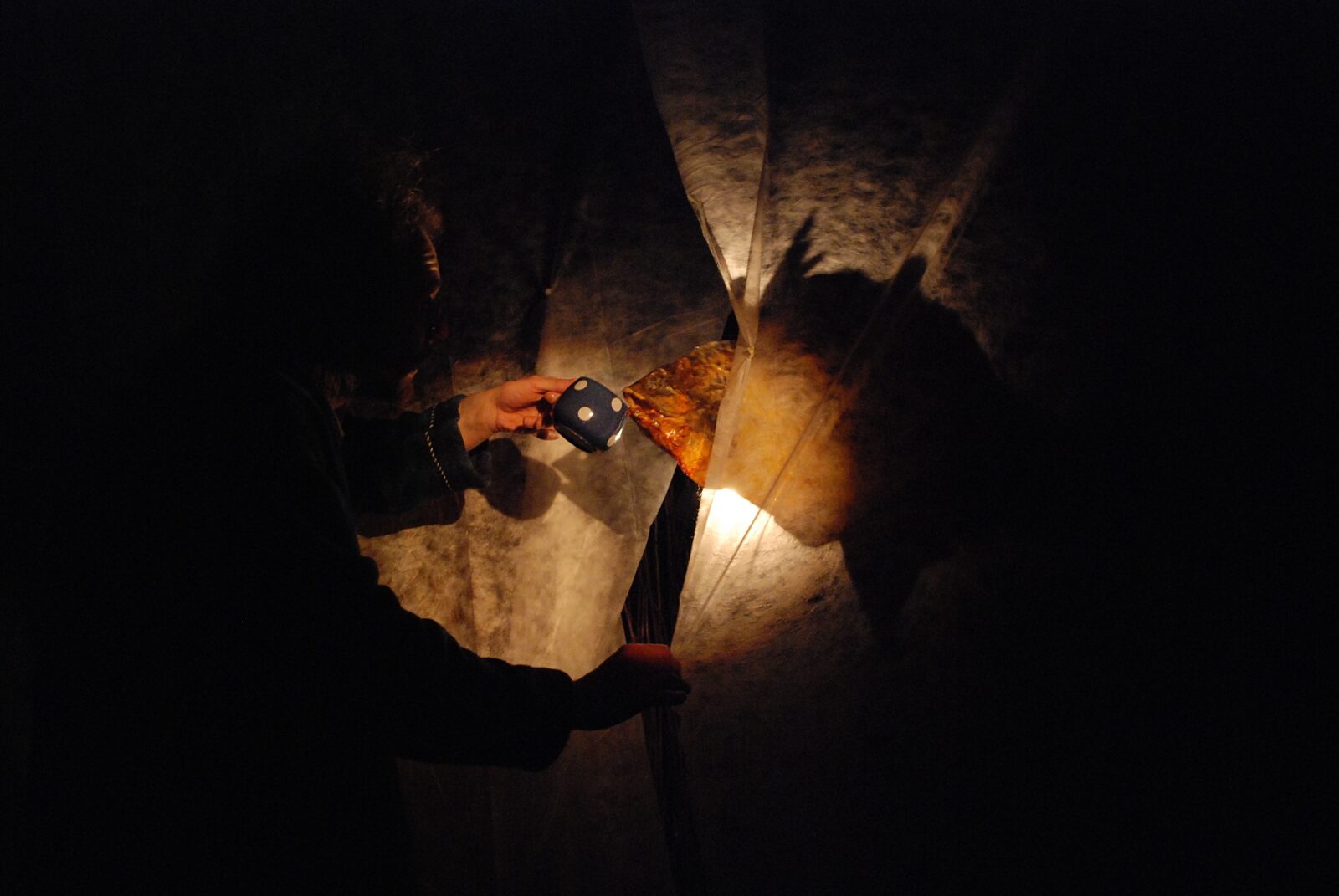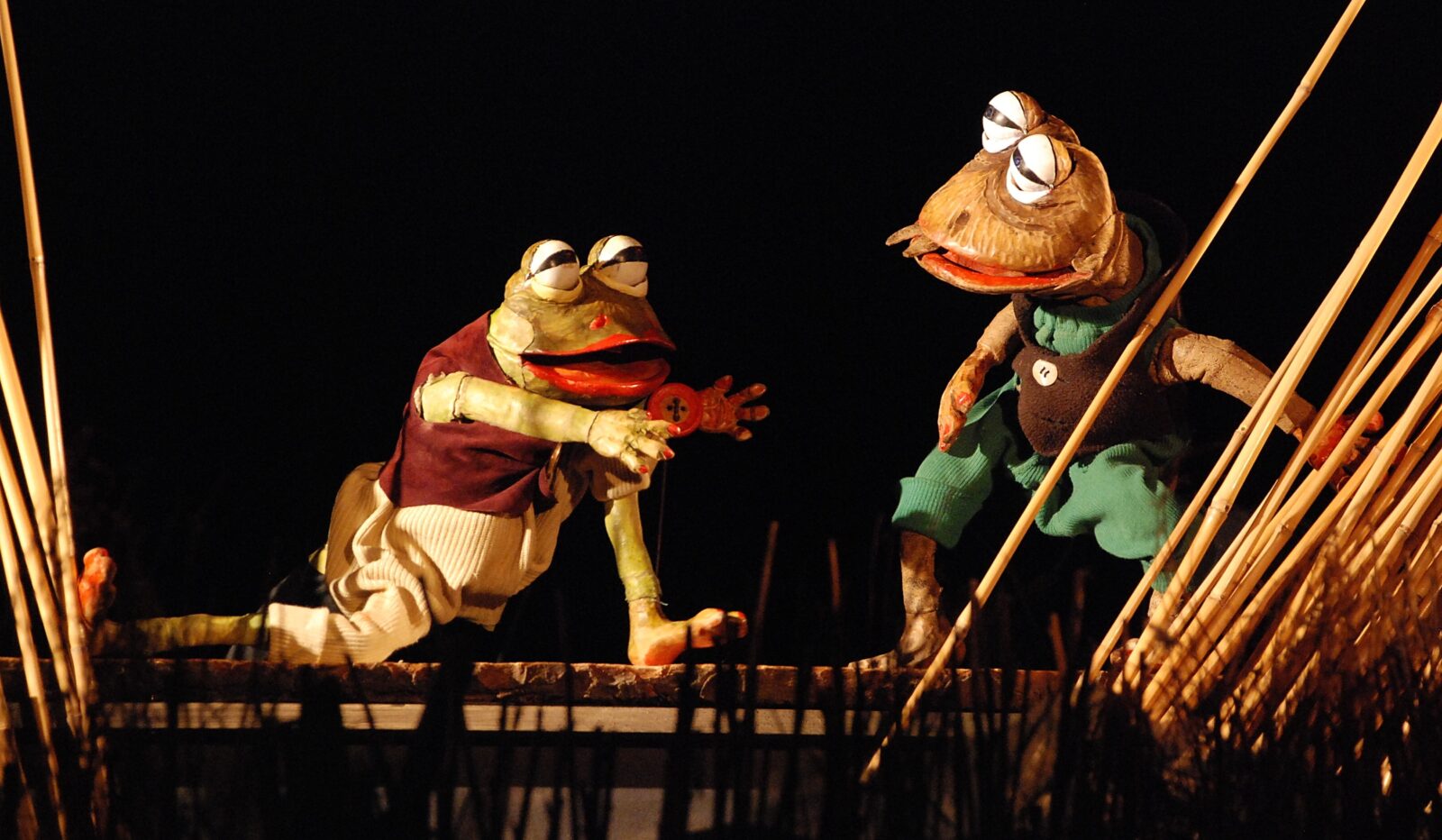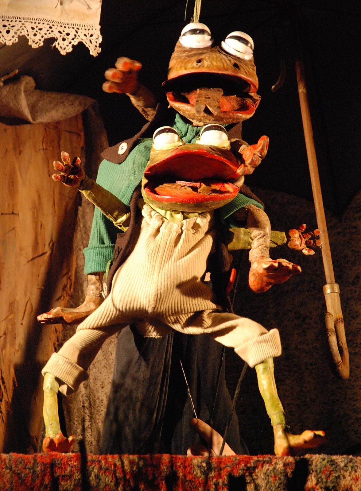The long-legged glove puppets are made out of wood and leather. Shiny paper fish swim in the play besides other wooden animals from the Old Man´s garden. The stage is made of bark, wood and bamboo grown in the garden of artist Antonín Maloň.