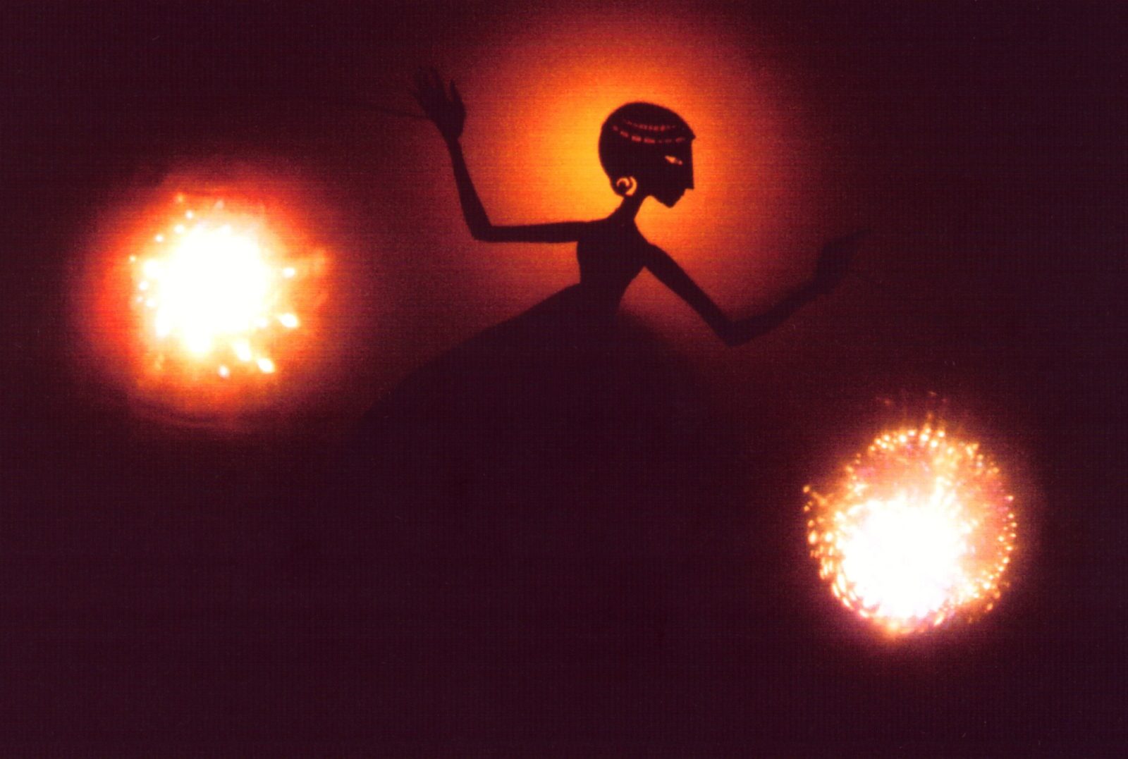 The story is based on the ancient Indian legend of the Mahabharata, about the love and perseverance of Princess Sávitrí, who rescues her husband from the grip of death. Visually impressive, the interplay of colourful shadows on a large screen (2 by 2 metres) is accompanied by the stylised voice of the narrator-musician, who uses a range of original, self-made and untraditional musical instruments. The design and sound of the production is loosely inspired by oriental stage techniques, creating a specific and original form.